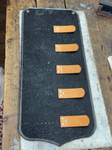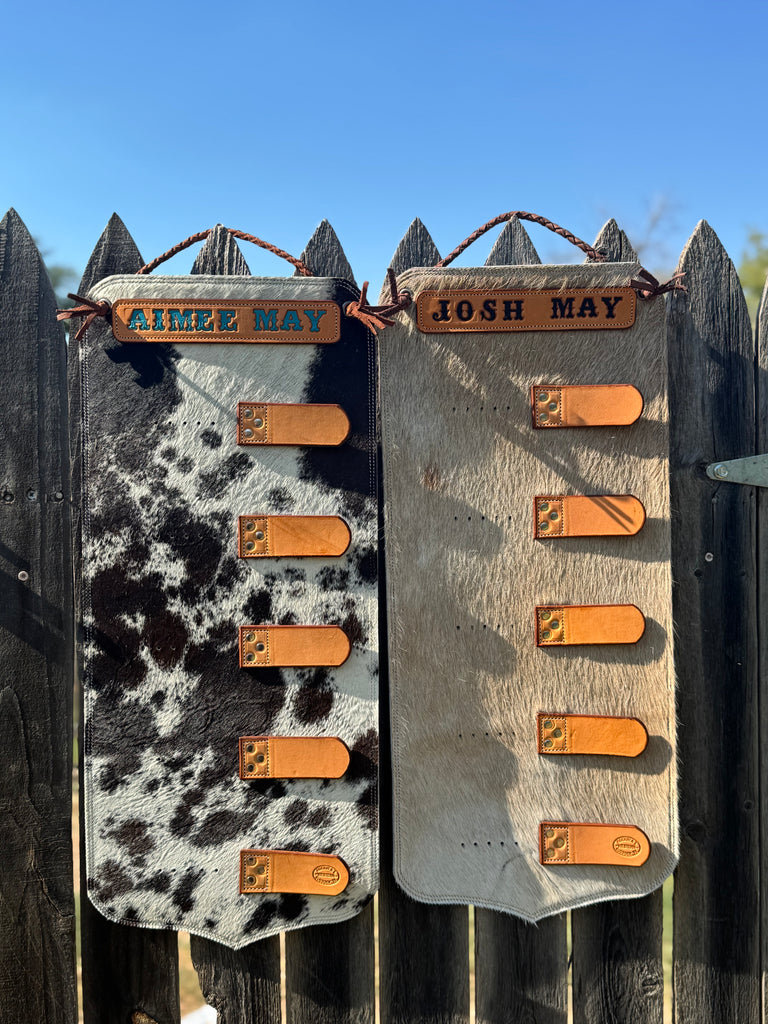 -These buckle holders hold 5 belt buckles and can be personalized with a name at the top.